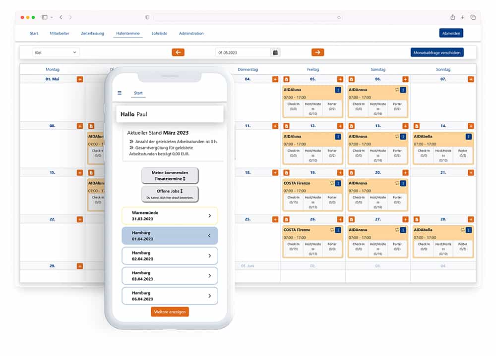 Die vip hanse touring unterstützt als Dienstleister Kreuzfahrtgesellschaften beim On- und Offboarding während der Hafenliegezeiten von Schiffen an allen Häfen der deutschen Nord- und Ostseeküste. Mitarbeiter der vip hanse touring kommen dabei als Hosts/Hostessen, Porter oder für den Check-In zum Einsatz. Einsatzplanung und Abrechnung erfolgten bisher aufwendig manuell und unter Einsatz von Standard-Software. Die Planung sollte durch eine individuelle Softwarelösung optimiert und Prozesse effizienter gestaltet werden.